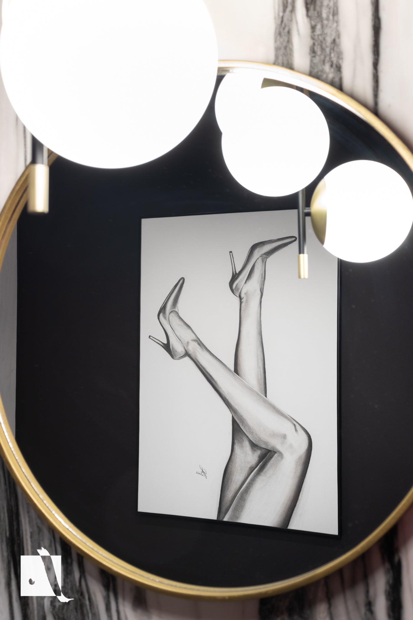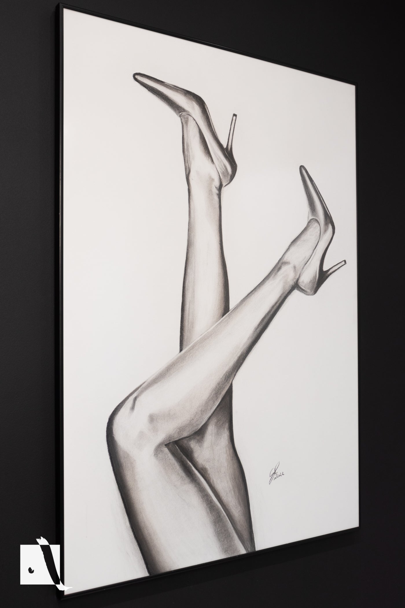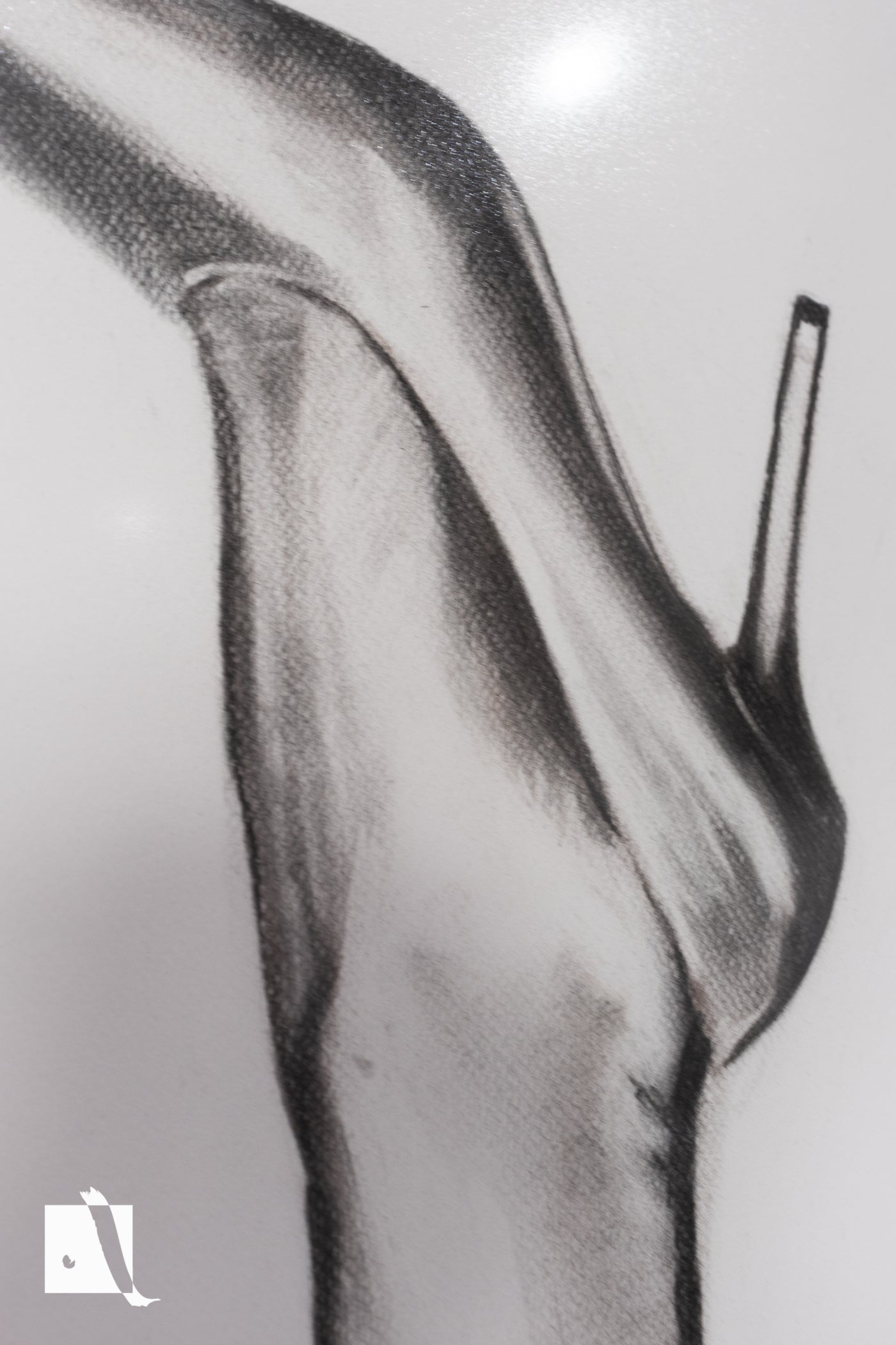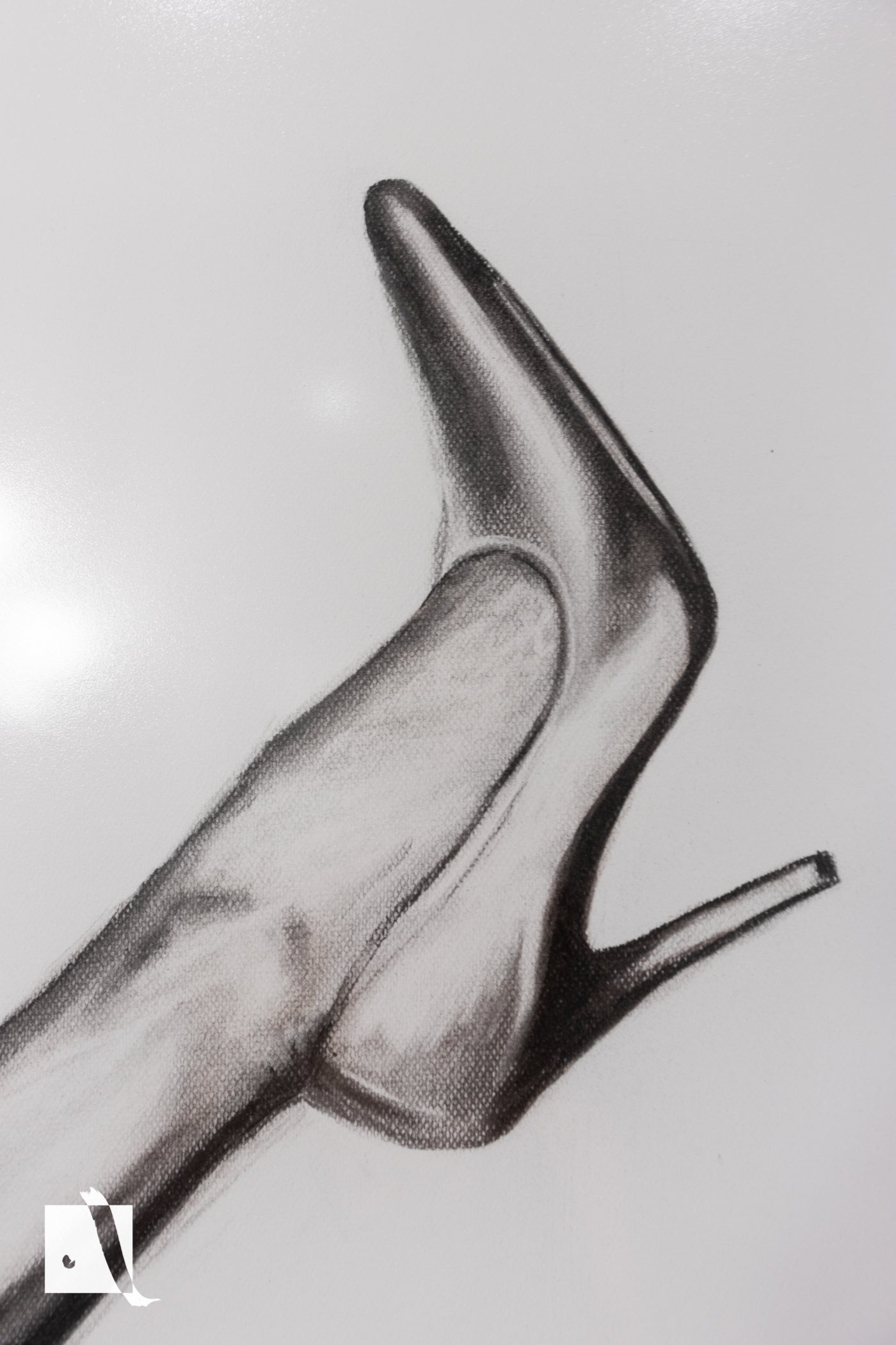 Desen realist cu picioare de femeie pe tocuri, în cărbune pe hârtie specială.