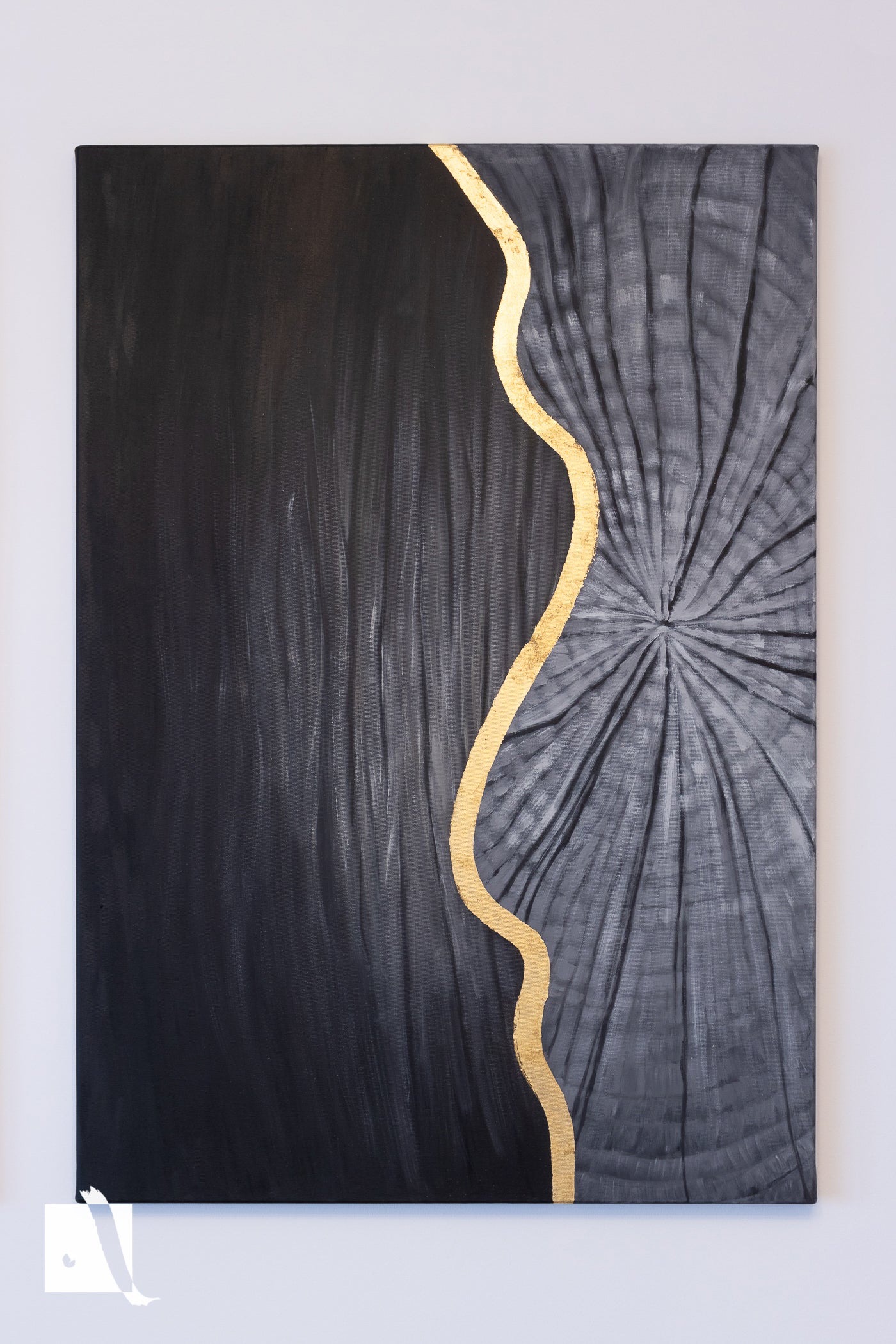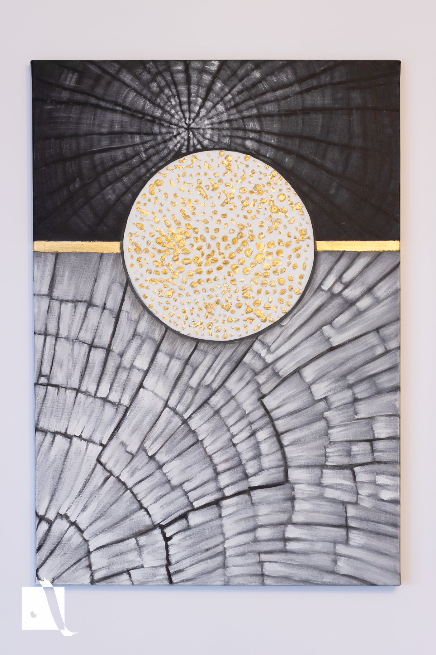 Pictură abstractă în relief 3D cu inserții de foiță de aur și vopsea acrilică.