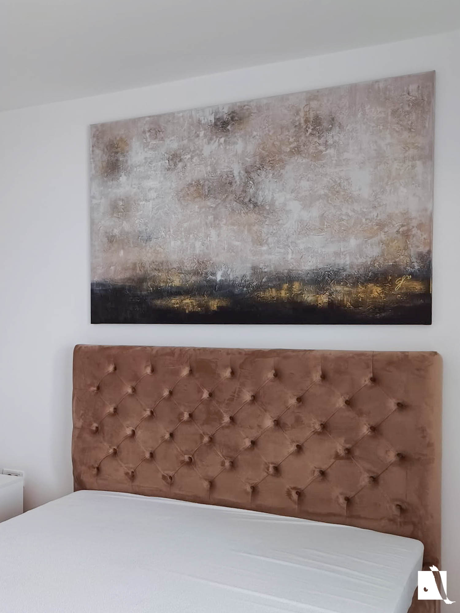 Pictură abstractă cu vopsea acrilică și atingeri aurii.